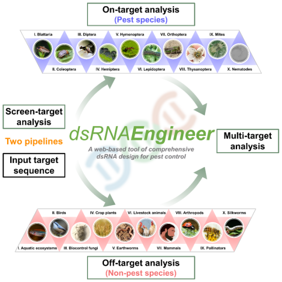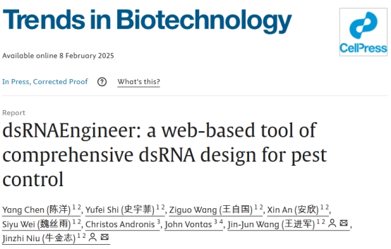 近日,公司王进军教授团队在Cell Press旗下子刊《Trends in Biotechnology》发表了题为“dsRNAEngineer: a web-based tool of comprehensive dsRNA design for pest control”的研究论文。该研究开发了一款名为“dsRNAEngineer”的在线工具(https://dsrna-engineer.cn/),该工具具备Screen-target(筛靶分析)、On-target(靶向分析)、Off-target(脱靶分析)和Multi-target(多靶点分析)四大功能,为RNA生物农药的开发提供了高效、安全的解决方案。随着RNA生物农药的兴起,该工具有望为RNAi生物技术在有害生物防治领域的应用提供有力支持,助力可持续农业的发展。