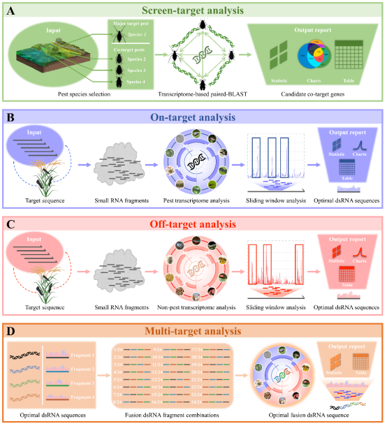 图2:dsRNAEngineer的四大核心功能。 (A) 筛靶分析(Screen-target):筛选对多种有害生物具有共靶向潜力的候选靶标基因;(B) 靶向分析(On-target):评估靶标序列对用户选择的有害生物的靶向效果;(C) 脱靶分析(Off-target):评估靶标序列对用户选择的非靶标物种的脱靶效应;(D)多靶点分析(Multi-target):设计可以靶向多个基因或有害生物的融合dsRNA。