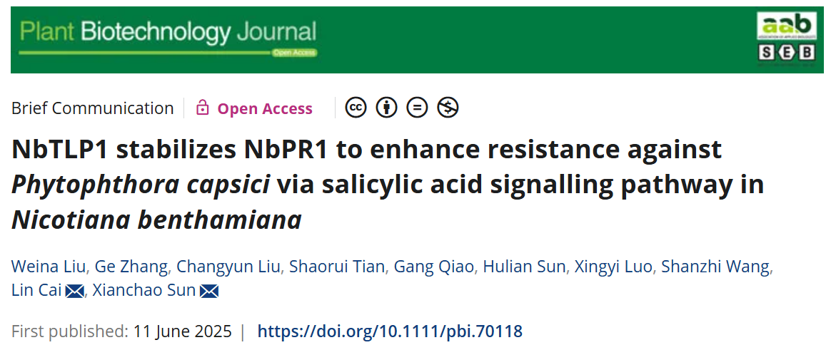 2025年6月11日,公司孙现超教授团队在《Plant Biotechnology Journal》发表题为“NbTLP1 stabilizes NbPR1 to enhance resistance against Phytophthora capsici via salicylic acid signalling pathway in Nicotiana benthamiana”的研究论文。该研究系统揭示了PR-5家族蛋白NbTLP1在烟草中通过稳定NbPR1蛋白,增强植物对辣椒疫霉的免疫机制,并证实该过程依赖于水杨酸信号通路。这一发现为解析卵菌病害的植物免疫响应提供了新思路,也为抗病育种提供了理论基础。