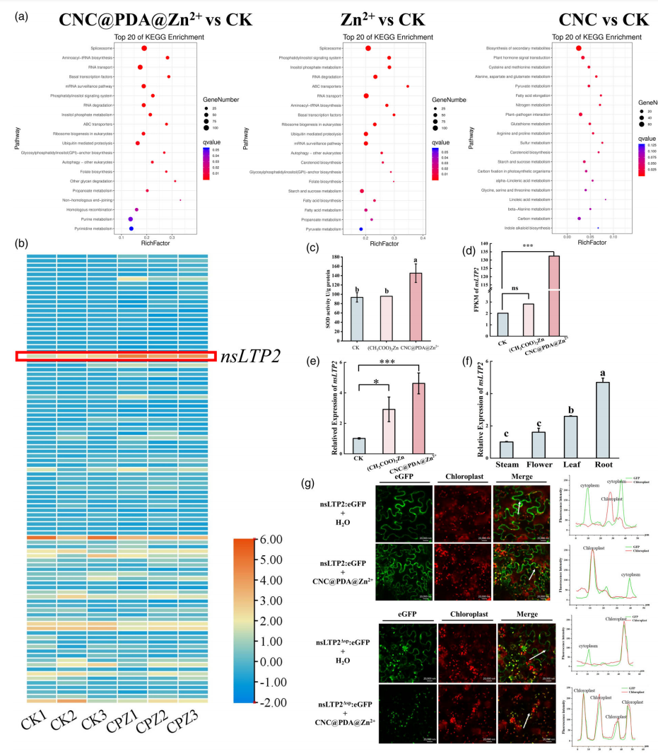 为了探究CNC@PDA@Zn²⁺诱导植物免疫的潜在机制,研究通过转录组分析证明CNC@PDA@Zn²⁺可诱导多个Zn²⁺结合蛋白表达,如SOD,并增强其酶活性(图4a-c)。此外,CNC@PDA@Zn²⁺显著上调非特异性脂质转运蛋白nsLTP2的表达,并改变其亚细胞定位至叶绿体及胞外区域(图4d–g),说明材料通过nsLTP2介导的免疫响应路径激活植物广谱抗性。