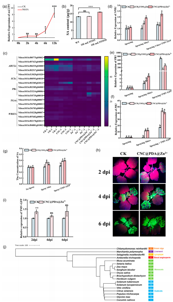 研究发现,CNC@PDA@Zn²⁺可通过激活水杨酸(SA)通路增强植物系统获得性抗性(SAR)。外施MeSA处理能显著诱导nsLTP2表达(图6a),而稳定过表达nsLTP2Δsp的植株中SA含量升高,且表达水平与SA呈剂量相关(图6b)。除此以外,CNC@PDA@Zn²⁺还上调nsLTP2、NPR1、PR1、PR2等SA相关基因表达,并在TMV感染下维持较高SA水平,抗性更稳定(图6c-g)。而在水杨酸缺失突变体NahG植株中,该材料诱导的抗性效果明显减弱(图6h-i),表明CNC@PDA@Zn²⁺通过SA信号通路发挥抗病毒作用。该结果从信号通路角度进一步强化了“材料–转运蛋白–激素通路”三者联动模型。同时,系统发育分析结果显示,nsLTP2在多种被子植物中广泛存在,具有较高保守性,尤其在茄科、禾本科等作物中均含多个拷贝,具备较强的功能潜力与适用性(图6j)。这为将该策略拓展至多种经济作物奠定了理论基础。