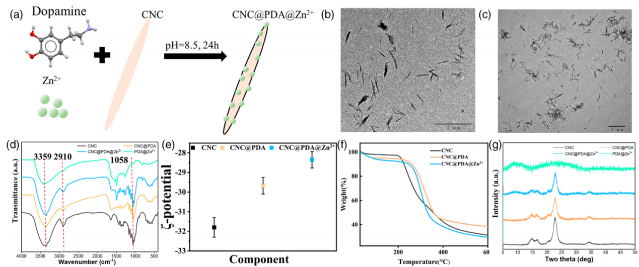Figure 1 Synthesis and characterization of CNC@PDA@Zn2+.
