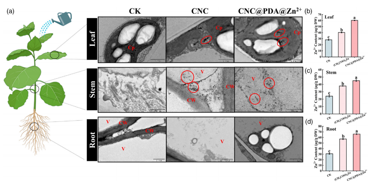 为揭示CNC@PDA@Zn²⁺的体内运输路径及其在植物锌营养调控中的作用,研究对处理后植株的锌分布情况进行了系统分析。透射电镜观察发现,CNC@PDA@Zn²⁺可进入并积累于叶片细胞的细胞质及叶绿体等结构中(图3a)。电感耦合等离子体质谱(ICP-MS)分析结果显示,CNC@PDA@Zn²⁺能显著提高植株不同组织(根、茎、叶)中的Zn²⁺含量(图3b–d)。同时,该处理不引起锌毒性,且伴随轻微生长促进作用。这表明CNC@PDA@Zn²⁺具有良好的系统运输能力和安全性,在保障锌供应的同时避免累积损伤。