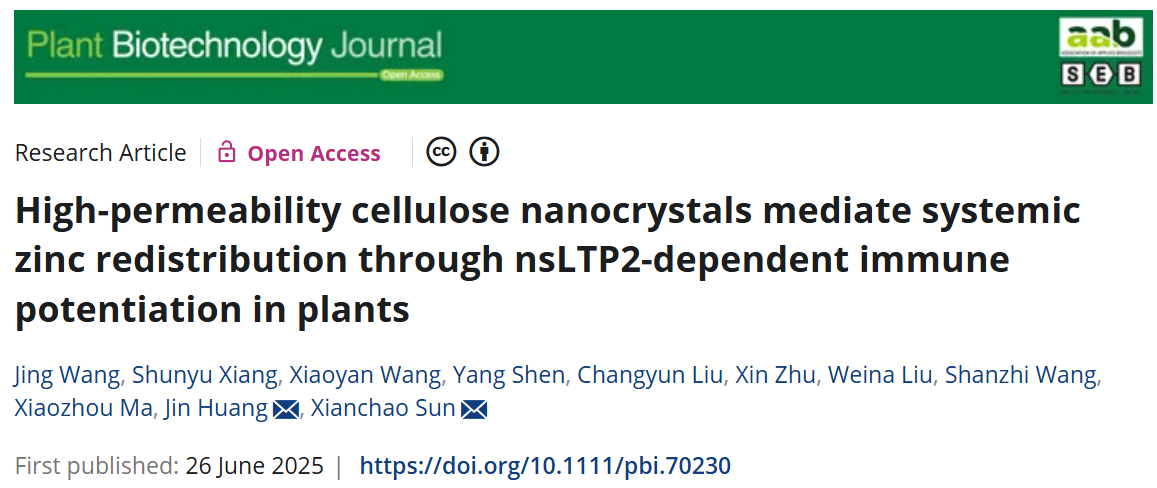2025年6月26日,公司孙现超教授团队在国际植物科学顶级期刊《Plant Biotechnology Journal》发表了题为 “High‐permeability cellulose nanocrystals mediate systemic zinc redistribution through nsLTP2‐dependent immune potentiation in plants”的研究论文。该研究创新性地开发了一种高渗透性纳米锌材料(CNC@PDA@Zn²⁺),不仅是目前已知可在植物体内发挥抗病毒作用的最低锌浓度递送体系,还揭示其可通过诱导非特异性脂质转运蛋白nsLTP2表达与定位变化,激活水杨酸(SA)信号通路,从而在植物体内实现系统性锌再分配与抗病毒免疫的双重调控。