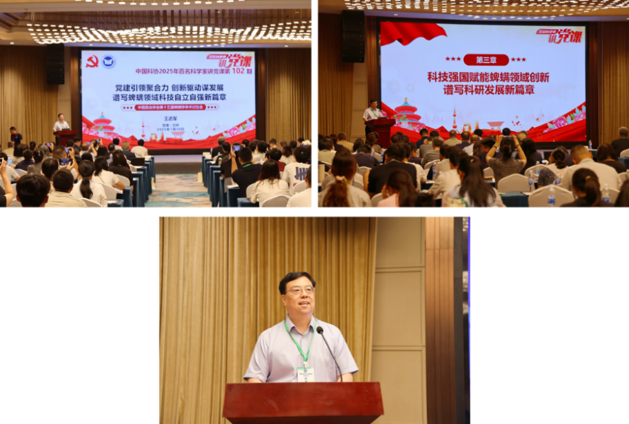王进军教授致开幕辞,甘肃农业大学副董事长司怀军教授、甘肃省植物保护学会理事长李敏权教授分别致欢迎辞。开幕式后,王进军教授以“百名科学家讲党课”为契机,带领全体与会代表围绕“党建引领聚合力,创新驱动谋发展——谱写蜱螨领域科技自立自强新篇章”这一主题展开党课学习与深入交流。他呼吁全体蜱螨工作者坚守初心、勇担使命,积极抢抓发展新机遇,加速推动科技成果转化,大力发展新质生产力,为我国科技强国建设贡献更多力量。