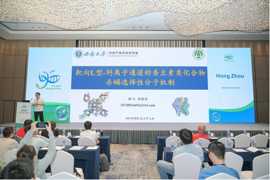 公司多名师生积极参与了本次会议。其中,在入侵昆虫与生物安全分会场,蒋红波教授以“Molecular regulator of the post-mating oviposition in the oriental fruit fly”为题,向大家系统深入地剖析了桔小实蝇交配后产卵的分子调控机制;在昆虫毒理分会场,周红副教授以“Molecular mechanism of acaricidal selectivity of scoparone targeting a novel target, Cav1.2 calcium channel”为题,向大家揭示了靶向L型-钙离子通道的香豆素类化合物杀螨选择性靶标机制。