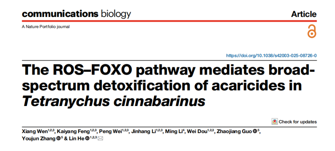 2025年8月23日,国际著名学术刊物《Communications Biology》在线发表了何林教授团队的最新研究成果《The ROS–FOXO pathway mediates broad-spectrum detoxification of acaricides in Tetranychus cinnabarinus 》。该论文进一步研究害螨解毒代谢的起始过程,揭示了朱砂叶螨借助氧化应激信号通路(ROS-FOXO)启动解毒代谢的杀螨剂广谱代谢通路。