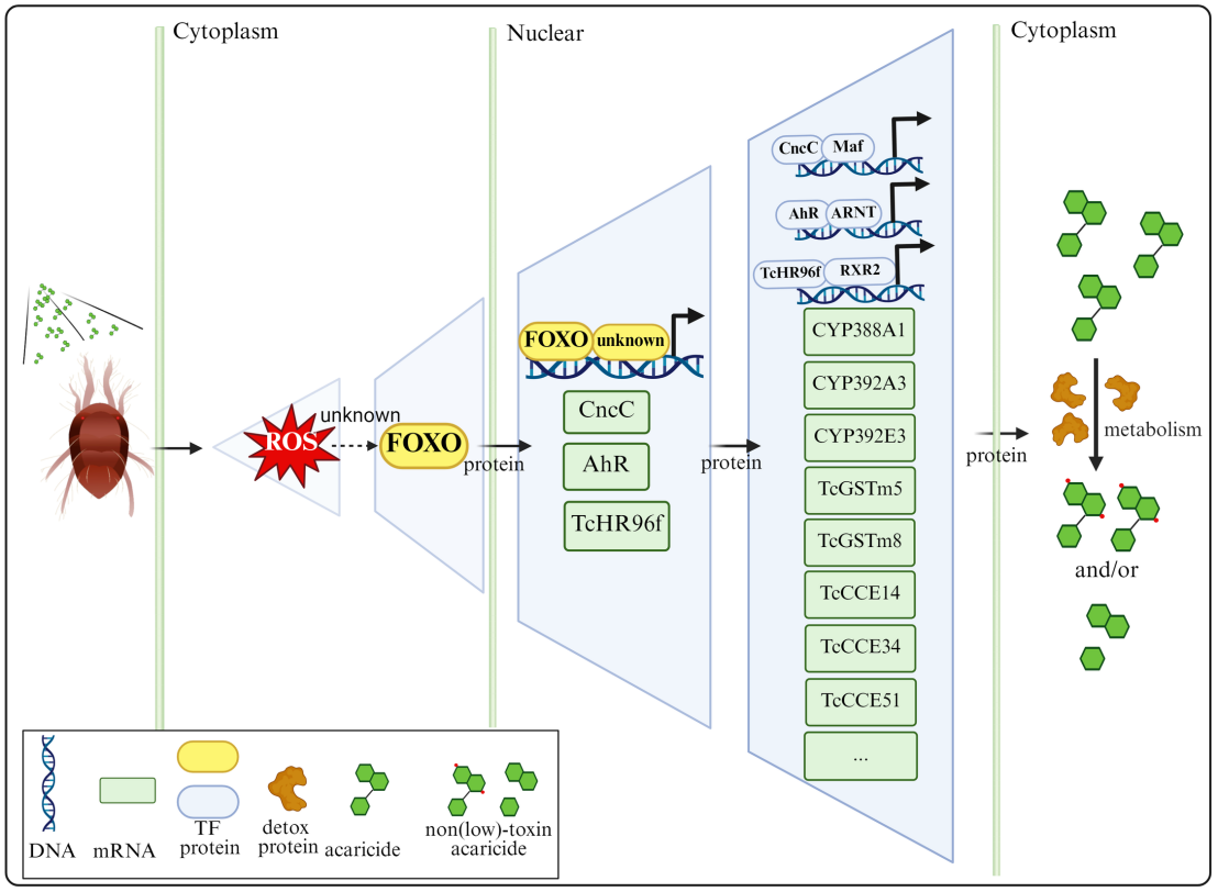 研究团队首先通过测定ROS含量发现不同类型的杀螨剂胁迫均会直接导致朱砂叶螨体内ROS积累。随后,利用高温胁迫、百草枯(ROS触发剂)和NAC(ROS抑制剂)处理朱砂叶螨等方法,从正、反角度证明ROS通过影响解毒酶活性,从而影响了朱砂叶螨对杀螨剂的敏感性。进一步研究表明,FOXO作为重要的转录因子,响应ROS积累并活化入核(在细胞核内聚集),进而调控下游异源物质感受器CncC、AhR和TcHR96f的表达。DAP-seq及荧光素酶报告基因等结果显示异源物质感受器CncC、AhR和TcHR96f可调控众多解毒酶基因上调表达。最后,药剂诱导、RNAi和重组蛋白体外代谢实验均明确了CYP392E3、CYP388A1、TcGSTm8和TcCCE34等解毒酶蛋白具有重要的代谢杀螨剂的功能。研究结果揭示了朱砂叶螨体内存在一条由氧化应激触发、ROS-FOXO启动的代谢杀螨剂的广谱性解毒代谢通路,即“外源化合物胁迫-ROS含量增加-FOXO活化入核-下游转录因子激活-解毒酶基因表达上调-外源化合物代谢”通路(图1)。