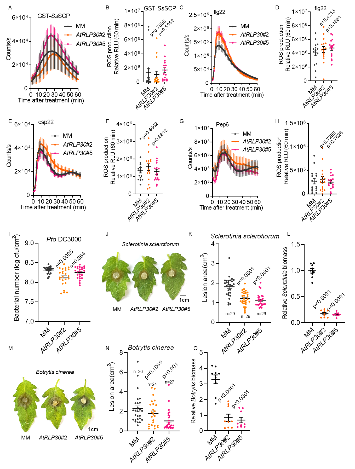 研究团队首先成功表达并纯化出蛋白纯度与结构完整的GST-SsSCP蛋白,在拟南芥、本氏烟草、番茄中,GST-SsSCP均能诱导强烈活性氧(ROS)爆发,并且拟南芥AtRLP30突变体完全丧失了对GST-SsSCP的响应,证实了SsSCP作为PAMP的功能及识别机制的保守性。
