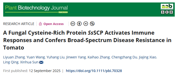 近日,Plant Biotechnology Journal杂志在线发表了由公司青玲教授团队孙新华课题组撰写的“A Fungal Cysteine-Rich Protein SsSCP Activates Immune Responses and Confers Broad-Spectrum Disease Resistance in Tomato ”论文。该研究为开发新型生物农药和利用抗病受体进行抗病育种提供了新思路。