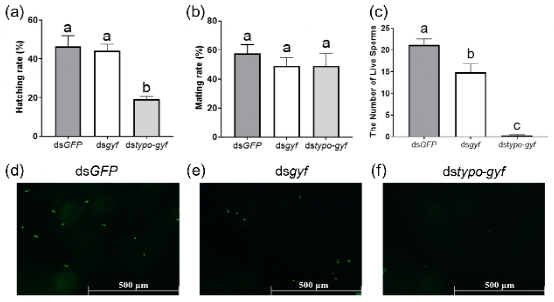 进一步利用RNAi 敲低typo-gyf 基因表达后,性成熟雄虫的活精子数量极显著降低,与野生型雌虫交配后其后代卵的孵化率显著下降;而敲低gyf 基因仅造成轻微影响。这充分说明,Y染色体上扩增的 typo-gyf 基因是维持雄性生育力的关键因子。