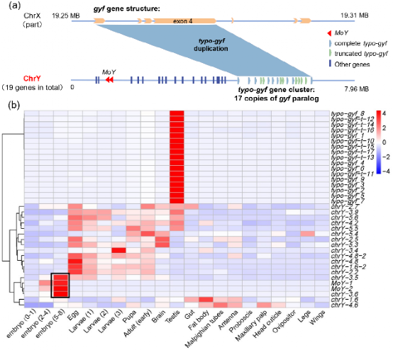 由于橘小实蝇Y染色体结构高度复杂,研究团队结合转录组与基因结构特征,最终鉴定出19个Y染色体连锁基因,并绘制了Y染色体全基因时空表达谱。其中,typo-gyf 基因在精巢组织中高度特异性表达。进一步对typo-gyf基因分析发现,该基因簇主要集中于Y染色体后半部,以正向串联的方式分布,这些基因源自X染色体上的gyf 基因,并在短期内经历了大规模扩张。有趣的是,研究人员还发现实蝇科昆虫中非常保守的性别决定起始信号M因子(MoY)在橘小实蝇Y染色体上呈多拷贝形式,这与蚊子、家蝇等双翅目昆虫显著不同。