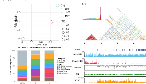 结构分析显示,橘小实蝇常染色体重复序列比例约为50.4%,而Y染色体重复序列比例高达92.1%,其卫星重复主要集中在前端。ATAC-seq 分析进一步揭示,Y染色体染色质开放区域明显低于X和常染色体,但仍存在部分开放区,为后续基于Y染色体的基因工程改造奠定了基础。