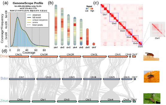 橘小实蝇是一种重要的农业入侵害虫,雌虫可在柑橘、芒果、番石榴和木瓜等多种水果果实内产卵,幼虫取食果肉,对果树产业造成严重经济损失。研究团队利用 PacBio HiFi 长读长测序结合 Hi-C 技术,首次获得了橘小实蝇雄虫的完整基因组,并发现该物种中存在巨大的拟着丝粒区域,并且鉴定了着丝粒序列。