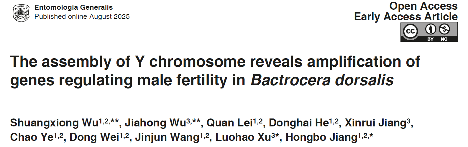 近日,公司昆虫分子生态学创新研究团队在昆虫学TOP期刊 Entomologia Generalis 在线发表了题为 “The assembly of Y chromosome reveals amplification of genesregulating male fertility in Bactrocera dorsalis(橘小实蝇Y染色体的组装揭示了基因扩张调控雄性生殖力)” 的研究论文,构建了橘小实蝇雄虫的高质量染色体级基因组,并通过染色体熵成功鉴定出Y染色体,这是实蝇科昆虫中首条被完整组装的Y染色体。研究发现,Y染色体上精巢特异性高表达的typo-gyf基因发生了显著扩张,并直接参与雄性生殖力的维持。该成果为探索基于Y染色体的遗传防控提供了新思路。