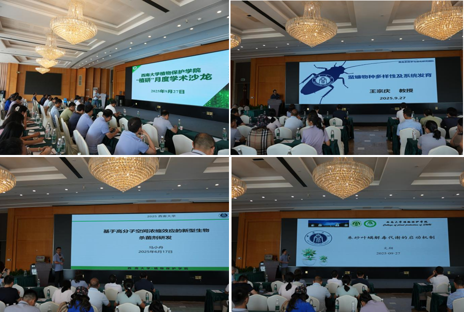 活动中,王宗庆教授、马小舟副教授、文翔博士后分别作了“蜚蠊物种多样性及系统发育”“基于高分子空间浓缩效应的新型生物杀菌剂研发”“朱砂叶螨解毒代谢的启动机制”为题的学术报告,汇报了各自研究课题的最新进展,内容充实、观点新颖,体现出扎实的专业功底。