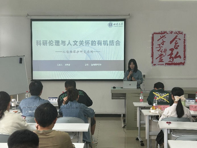 分享会伊始,陈李菡同学以植物保护学科为例,分别从科研伦理的基本原则与实践、人文关怀在植物保护研究中的重要性、伦理审查机制与人文价值的融合、科技进步与人文关怀的平衡、科研人员的道德责任与社会影响等五个方面进行分享,为大家带来对科研伦理与人文关怀方面的思考与感悟。