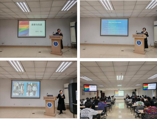 毛艺以观察同学们衣服色彩、剖析不同季节对穿着的影响开篇讲座,迅速吸引同学们,引入美育世界。随后,她深入讲解美育在中西方历史的演变。东方传统中,梳理先秦美育萌芽与哲学奠基,介绍宋元明清美育世俗化与理论深化,展示《多宝塔碑》《玄秘塔》《洛神赋》及元代青花瓷器等作品呈现不同时期美育表现。西方思想演进部分,重点讲19世纪浪漫主义与现代主义美育交织。接着,她结合实际阐述日常生活中美育体现,以服饰审美为例,从色彩心理学运用、材质触觉教育、廓形结构美学等方面讲解。最后,毛艺强调,美育与生活紧密相连、相互促进,生活中处处有美待发现欣赏。毛艺员工渊博的学识和生动的讲解,为在场师生搭建起一座连接美育理论与生活实践的桥梁,不仅让大家对美育有了更系统、更深入地认识,也激发了大家在生活中发现美、感受美、创造美的热情,获得了师生们的一致好评。