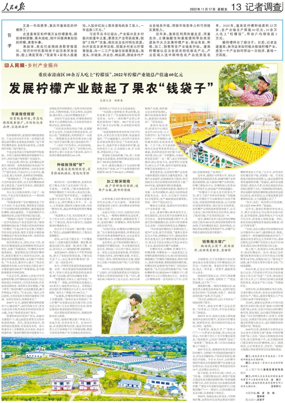 近期,《人民日报》关注潼南发展柠檬产业。潼南区利用热量充足、雨量充沛、土壤偏酸性和灌溉便利等自然资源条件大力发展柠檬产业,推动育苗、种植、加工、销售等全产业链条升级。潼南柠檬被认定为全国名特优新农产品,产业区域入选中国特色农产品优势区名单。2022年,潼南区柠檬种植面积32万亩,全产业链总产值逾60亿元,10余万人吃上“柠檬饭”,带动户均增收超2万元。