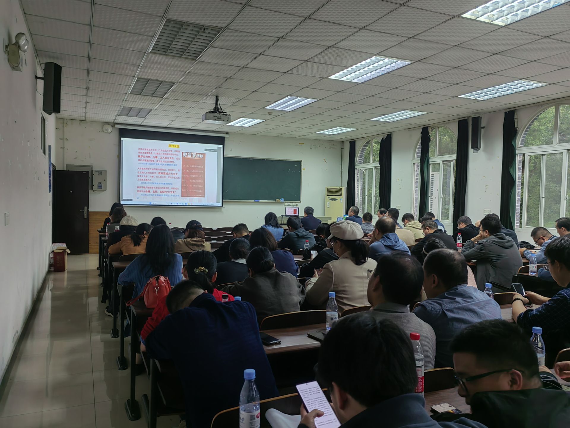 2023年11月3日下午2:30,全院教职工在322会议室分会场听取“弘扬教育家精神 努力成为大先生”师德教育专题报告。“好老师要做到学为人师、行为世范”如何做一名好老师呢?在总书记看来,好老师没有统一的模式,可以各有千秋、各显身手,但有一些共同的、必不可少的特质。“有理想信念、有道德情操、有扎实学识、有仁爱之心”,这是习近平心中好老师的四条标准。习近平总书记多次强调,要在全社会营造尊师重教的良好风尚,让教师成为“让人羡慕的职业”“最受社会尊重的职业”,让广大教师“安心从教、热心从教、舒心从教、静心从教”。