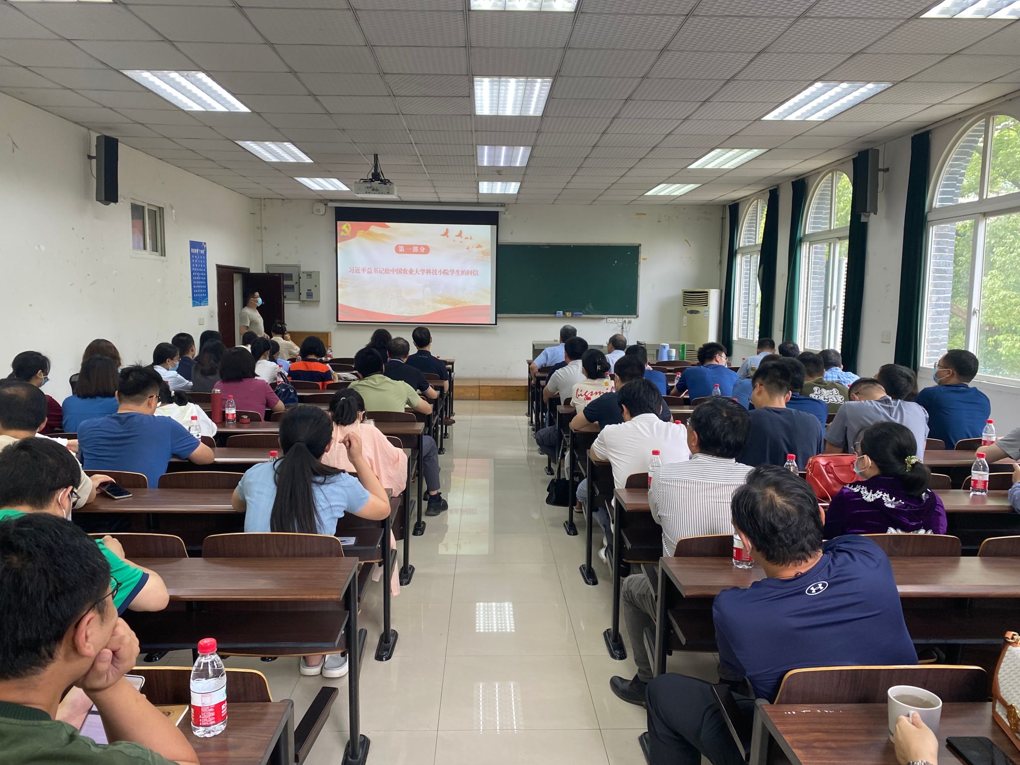 教工第二党支部书记吴根土领学《习近平总书记给中国农业大学科技小院的员工回信》。党的二十大对建设农业强国作出部署,希望同学们志存高远、脚踏实地,把课堂学习和乡村实践紧密结合起来,厚植爱农情怀,练就兴农本领,在乡村振兴的大舞台上建功立业,为加快推进农业农村现代化、全面建设社会主义现代化国家贡献青春力量。