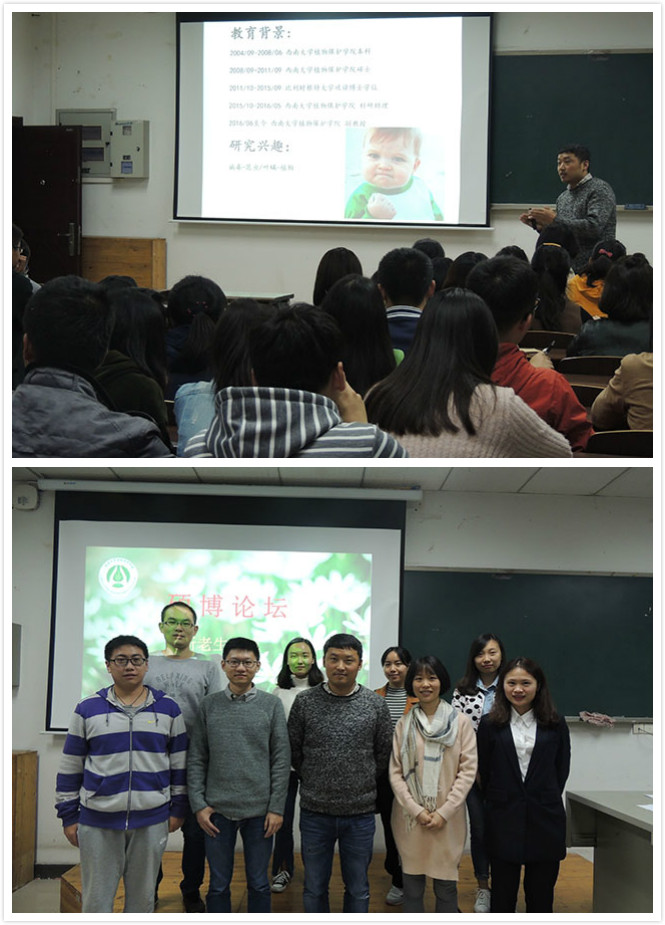 本次硕博论坛邀请了公司昆虫分子生态实验室的牛金志副教授、2015级农业昆虫与害虫防治专业的博士研究生侯秋莉、2015级农药学专业的硕士研究生敖已倩云、2015级植物病理学专业的硕士研究生彭浩然作为主讲嘉宾。