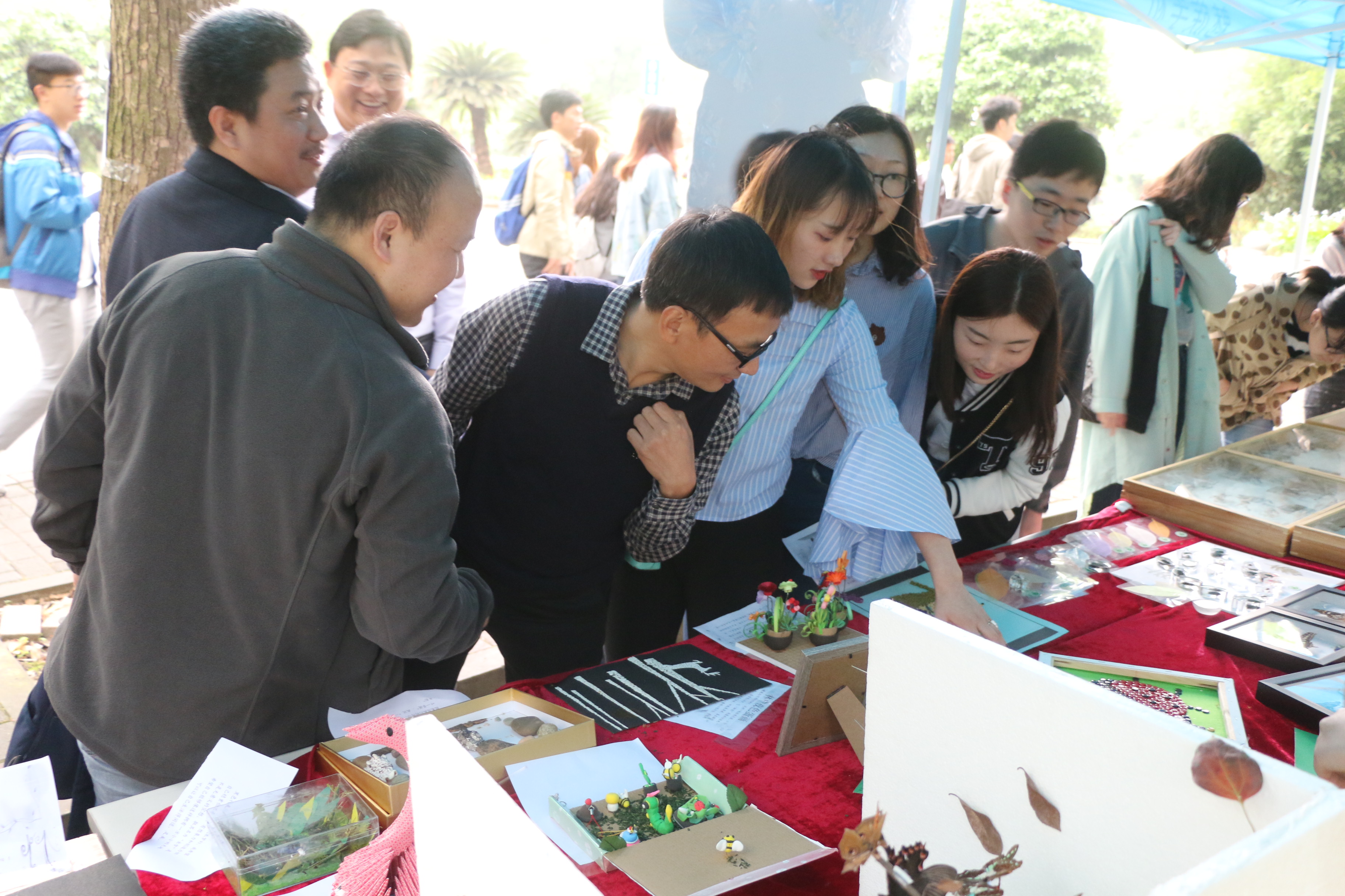 “窥叶寻豸,刹那芳华”体验区。体验区设立在樟树林右侧,员工和市民可以在工作人员的指导下,体验叶脉书签、昆虫琥珀和植物相框等独具特色又内涵丰富的手工制作,亲身感受昆虫植物世界的乐趣。