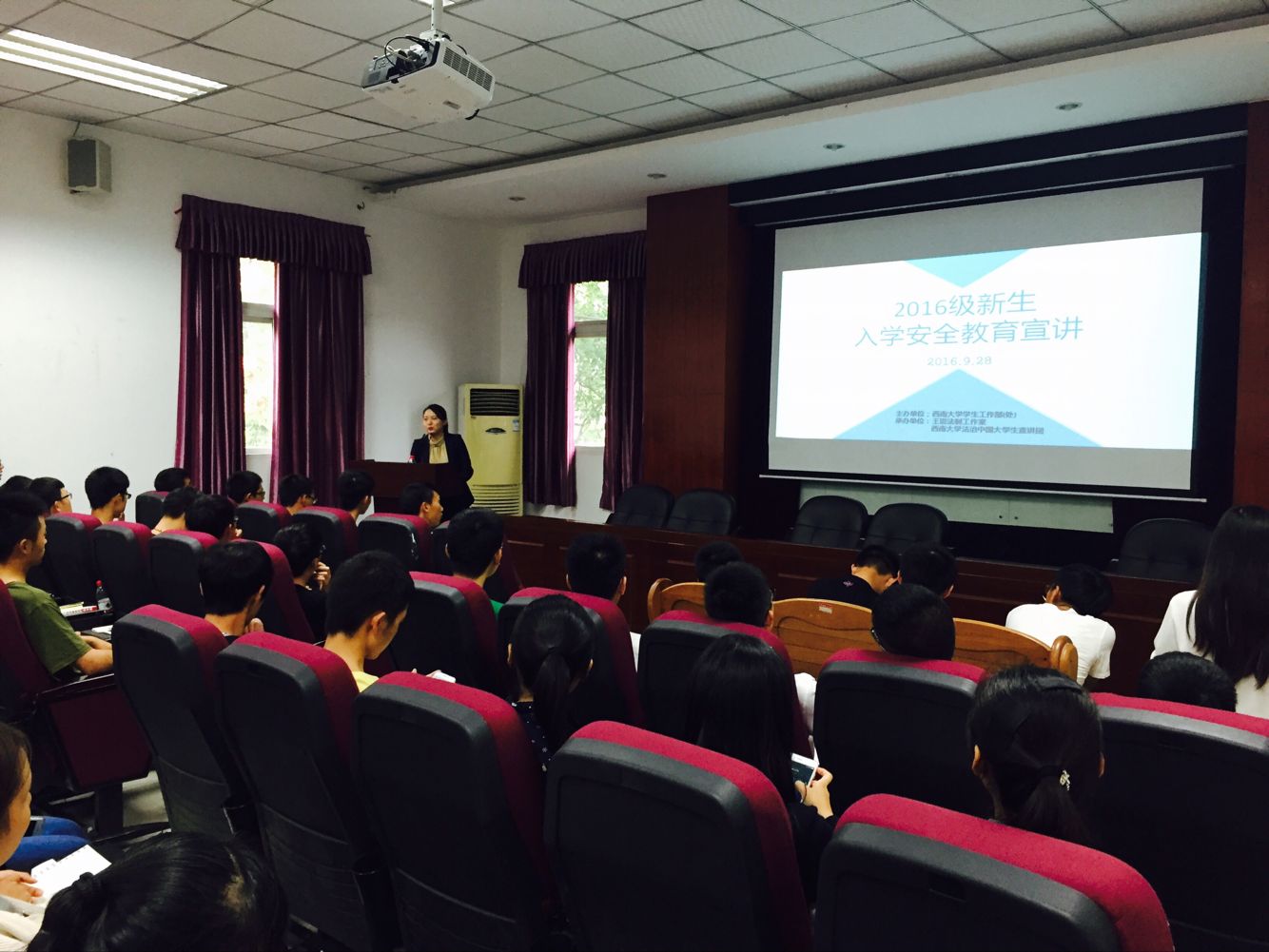 9月28日,伟德体育邀请到bevictor伟德法治中国老员工宣讲团王卓老师为2016级新生普及安全知识。王老师从日常出行隐患、电信网络诈骗、宗教信仰等六个方面分别以文字解说、视频播放的形式进行讲解。同学们认真听讲记录,并用手机拍下ppt屏幕上的注意事项。讲座持续时间约九十分钟,同学们现场反馈良好。