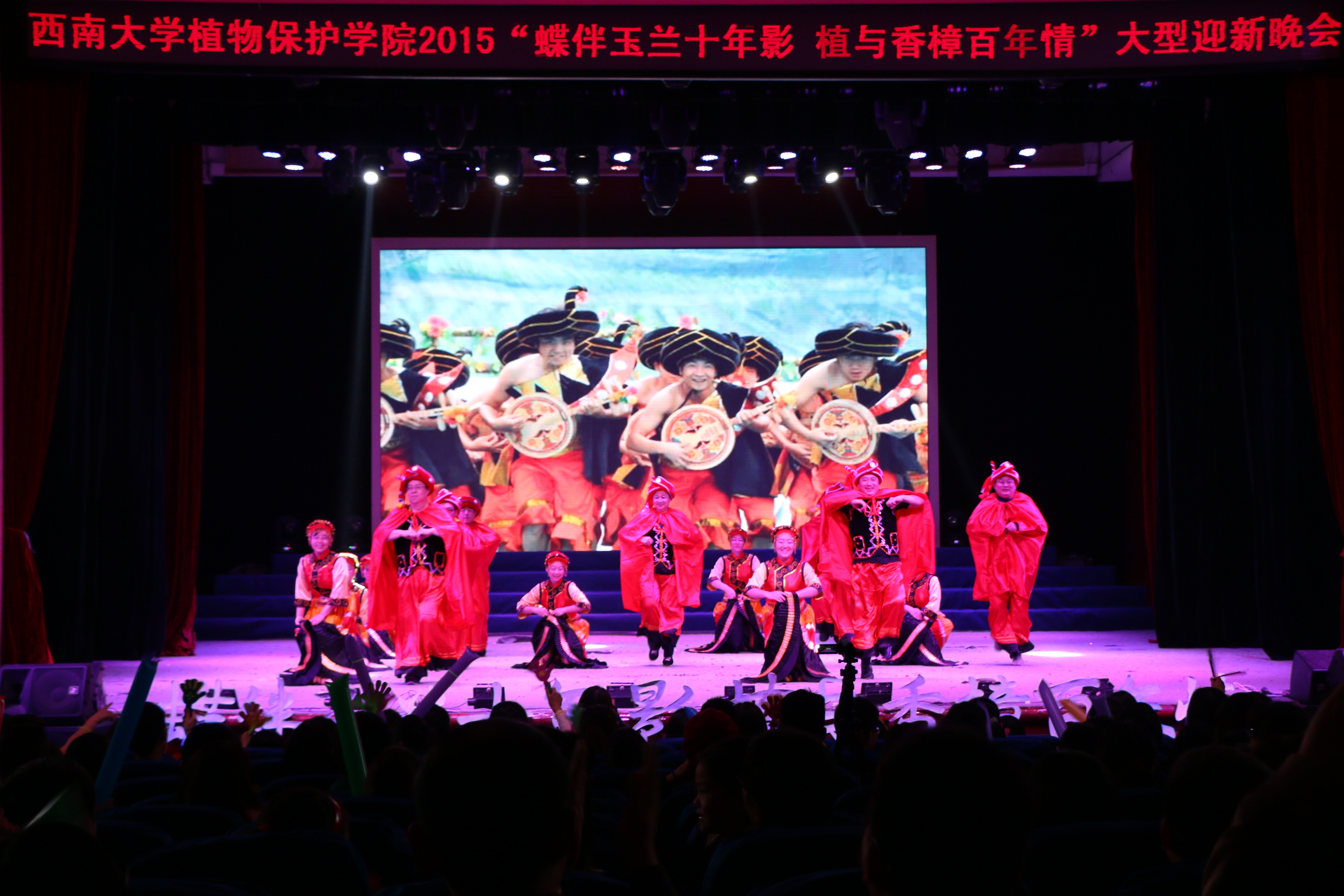 11月21日晚7点整,光大礼堂内掌声雷动、热情高涨,晚会在现场观众的热情呼唤声中拉开帷幕。精彩节目轮番上演,视听盛宴盛况空前。当悠扬的号角声吹响,公司的领导、教授、青年教师们踏着欢快的脚步闪亮登场,董事长助理、农学部部长王进军教授、公司党委书记王亨洪老师、经理刘怀教授、党委副书记李玉胜老师与谭万忠教授、陈力教授、青玲教授、孙现超研究员、白耀宇教授等一起载歌载舞,欢乐跳跃。台上,明艳的彩裙翻转、红色的披风飞扬;台下,掌声、欢呼声、欢笑声经久不息;整个礼堂陷入一片欢乐的海洋。老师们的精彩演出掀起了晚会的高潮,《欢乐的彝家山寨》给现场观众留下了深刻的印象。