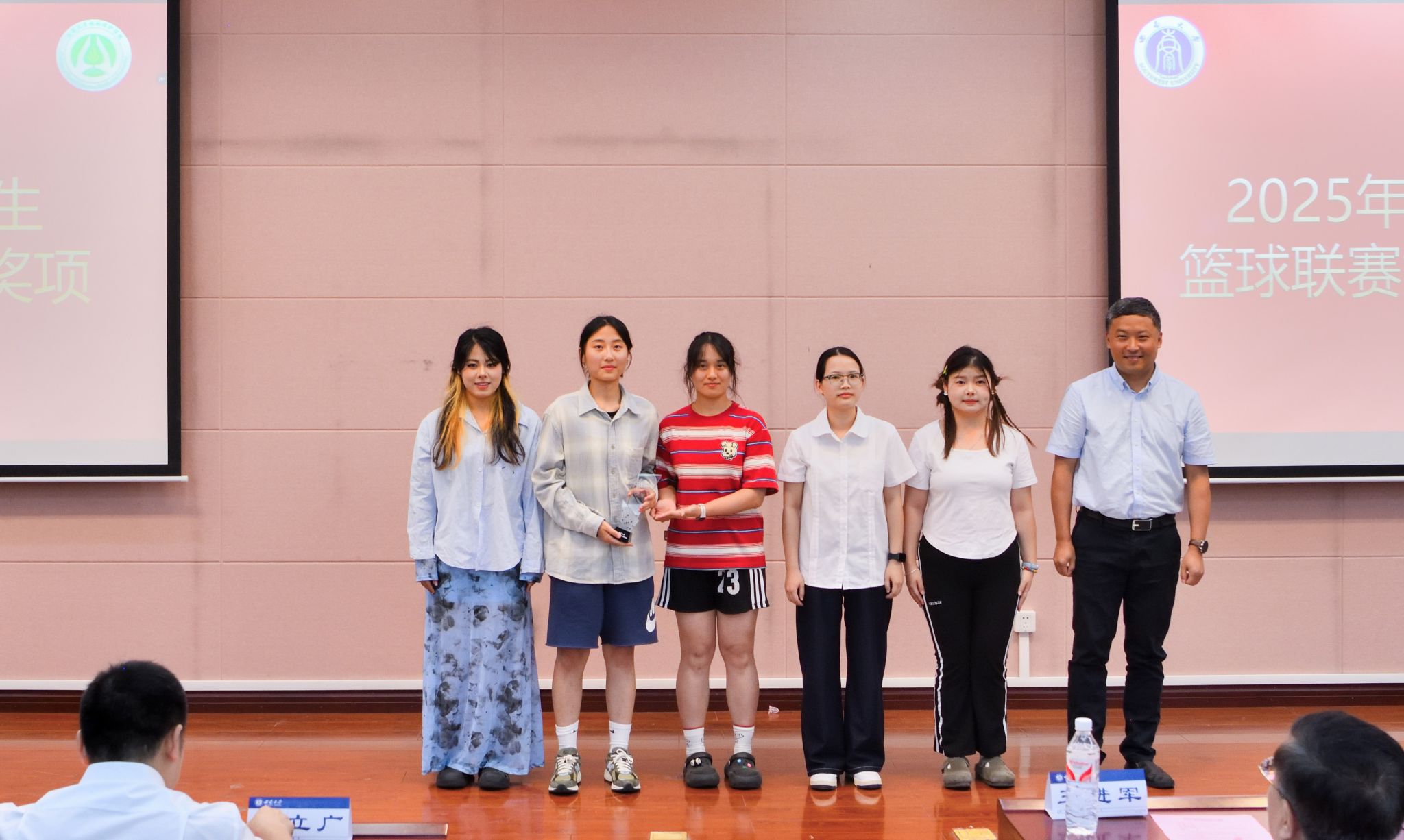 在激昂欢快的颁奖音乐声中,王进军董事长为中国国际老员工创新大赛国赛获奖项目指导教师及2025年优秀毕业生代表颁奖,牛金志副经理为2025年bevictor伟德员工篮球联赛女子组季军颁奖,杨宇衡副经理为加多宝·学子情乡村振兴人才奖学金获奖代表颁奖。